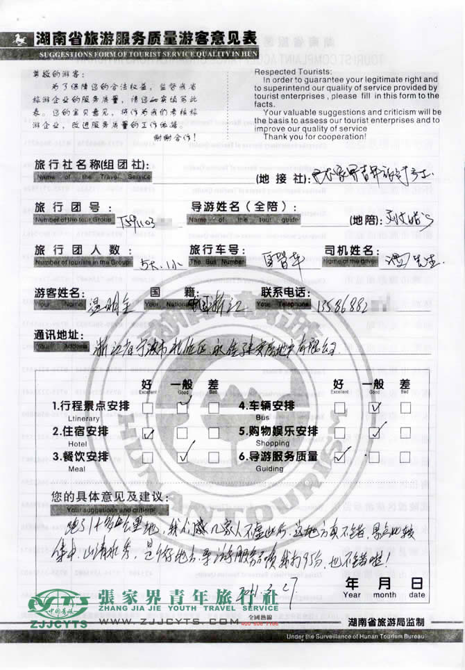 浙江寧波市“溫先生”與張家界青旅旅游顧問——“李 霞”在3月16日取得聯(lián)系,經(jīng)過2次在線溝通商談和電話溝通,最后雙方達成協(xié)議并簽訂了《國內(nèi)旅游組團標準合同》,于3月22日下午抵達張家界,之后便開始了湘西之旅。 此次行程是由我們優(yōu)秀導游——劉文娟,負責旅游接待工作,劉導在旅游過程中講解詳細,服務周到,客人也很滿意。并給予導游服務品質評分95分!