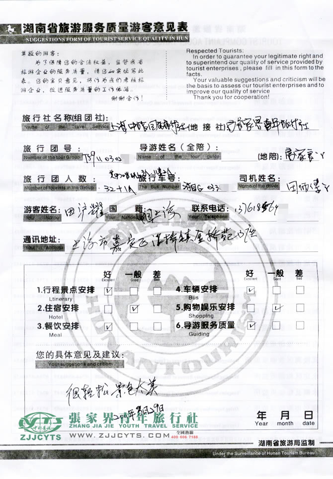 上海嘉定區(qū)“田先生”與張家界青旅旅游顧問(wèn)——胡曉蘭在3月19日取得聯(lián)系,經(jīng)過(guò)2次在線商談和電話溝通,雙方達(dá)成協(xié)議并簽訂了《國(guó)內(nèi)旅游組團(tuán)標(biāo)準(zhǔn)合同》,于3月25日晚抵達(dá)張家界,之后便開(kāi)始了走進(jìn)湘西、暢游湘西之旅。 此次行程是由我們優(yōu)秀導(dǎo)游——房家良,負(fù)責(zé)旅游接待工作,房導(dǎo)在旅游過(guò)程中講解詳細(xì),服務(wù)周到,客人比較滿(mǎn)意。