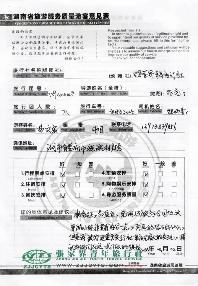 湖南婁底市“苗先生”與張家界青旅旅游顧問——“張德建”在3月15日取得聯(lián)系,經(jīng)過一次在線商談和多次電話溝通,雙方達(dá)成協(xié)議并簽訂了《國內(nèi)旅游組團(tuán)標(biāo)準(zhǔn)合同》,于3月30日午午2點(diǎn)許抵達(dá)張家界,之后便開始了湘西之旅。 此次行程是由我們優(yōu)秀導(dǎo)游——陳亮,負(fù)責(zé)旅游接待工作,陳導(dǎo)在旅游過程中講解詳細(xì),服務(wù)周到,客人也很滿意。并給予導(dǎo)游服務(wù)“服務(wù)好”的評(píng)價(jià)!