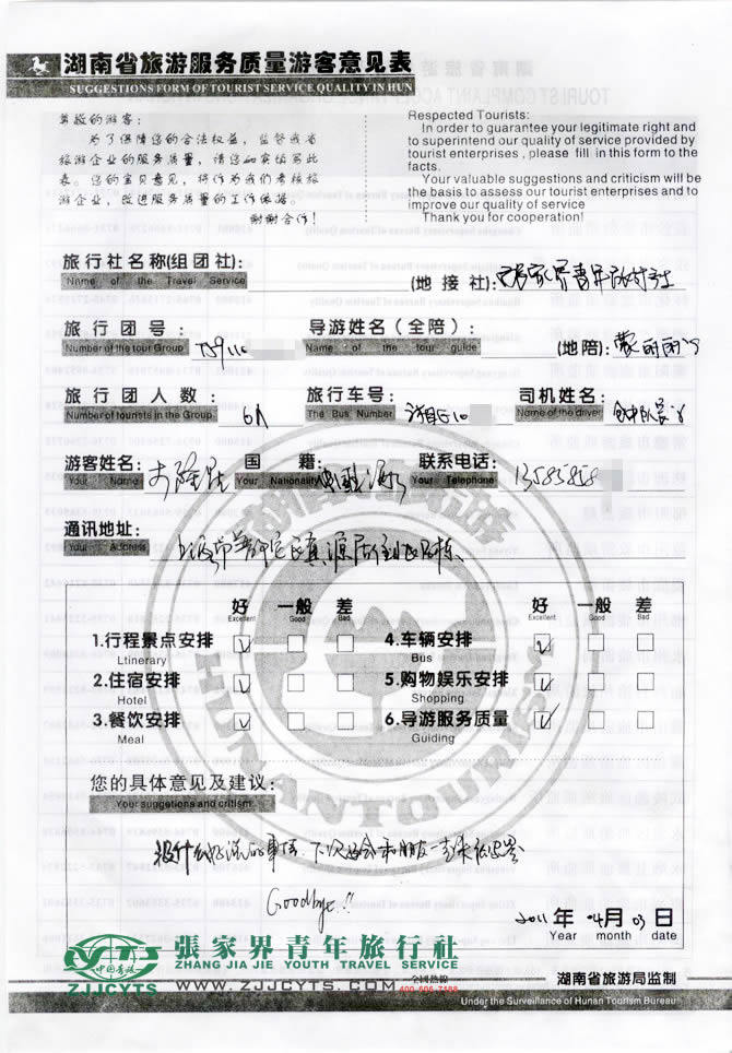 上海普陀區(qū)“李先生”與張家界青旅旅游顧問——劉文英在3月22日取得聯(lián)系,經(jīng)過3次的商談,雙方達成協(xié)議并簽訂了《國內(nèi)旅游組團標準合同》,于3月30日中午抵達張家界,次日便開始為期4日的走進湘西之旅。 此次行程是由我們優(yōu)秀導(dǎo)游——蒙麗麗,負責旅游接待工作,蒙導(dǎo)在旅游過程中講解詳細,服務(wù)周到,客人也很滿意。