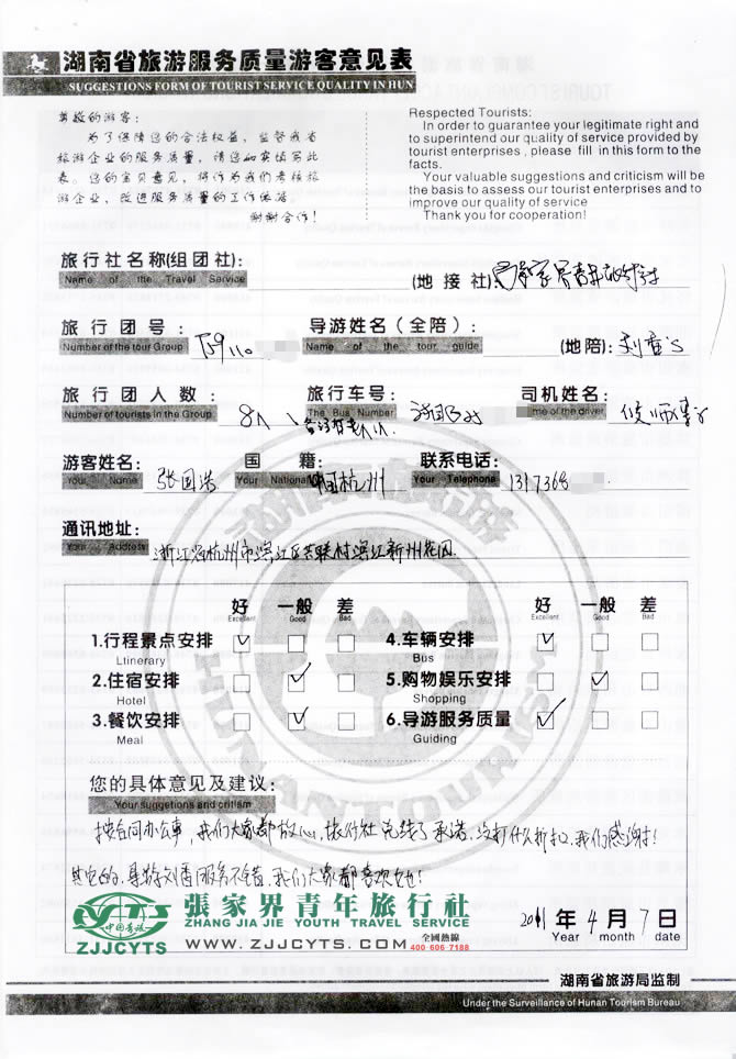 浙江杭州市“張先生”與張家界青旅旅游顧問——“田小美”在3月23日取得聯系,經過3次的在線商談和幾次電話后,雙方達成協(xié)議并簽訂了《國內旅游組團標準合同》,張先生和朋友8人一行于4月2日中午11:00許抵達張家界,次日便開始了為期5天的走進湘西之旅。 此次行程是由我們優(yōu)秀導游——劉 香,負責旅游接待工作,劉導在旅游過程中講解詳細,服務周到,客人也很滿意。并給予導游服務“服務不錯”評價!