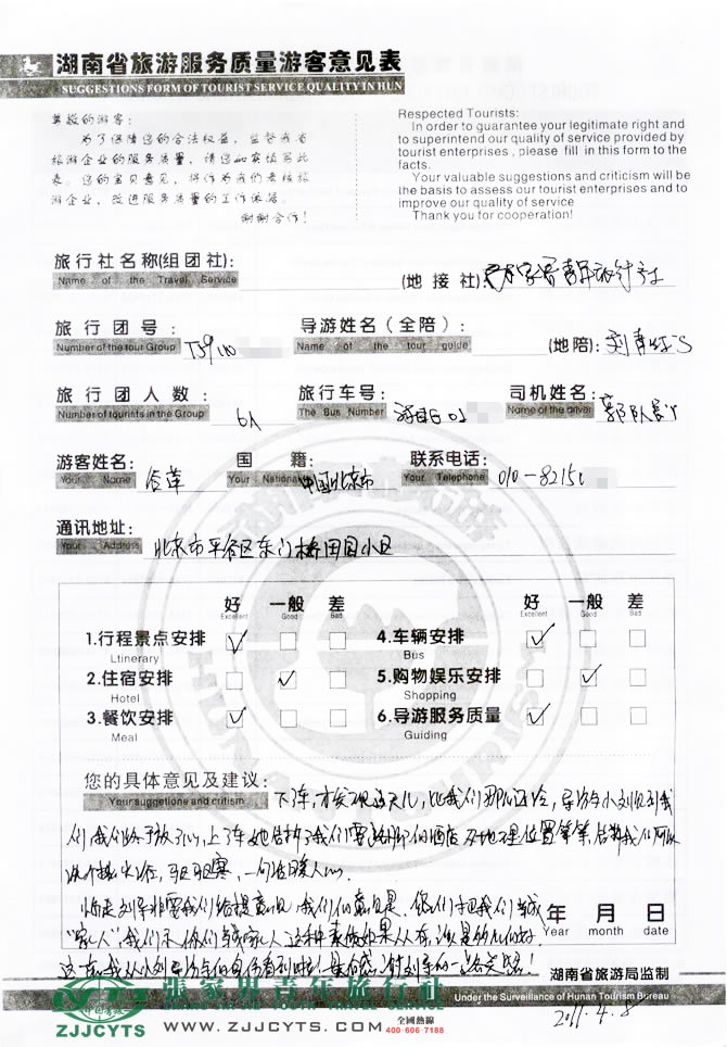 北京平谷區(qū)“谷女士”與張家界青旅旅游顧問——“趙艷芳”在3月25得聯(lián)系,經(jīng)過4次在線溝通商談,雙方達成協(xié)議并簽訂了《國內旅游組團標準合同》,谷女士6人一行于4月4日抵達張家界,之后便開始為期4天內的玩轉湘西之旅。 此次行程是由我們優(yōu)秀導游——劉青紅,負責旅游接待工作,劉導在旅游過程中講解詳細,服務周到,客人玩的很開心,也很滿意。并給予導游服務較高的評價!