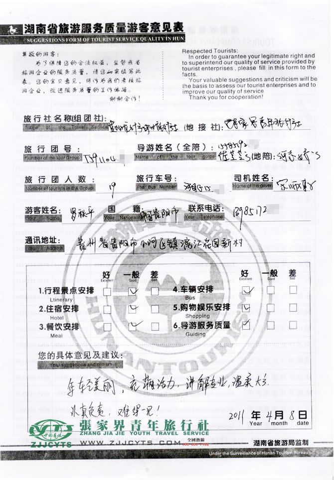 非常鳴謝“貴陽龍行神州旅行社”給予的合作機(jī)會(huì),同時(shí)也感謝羅先生一行對我社行程及導(dǎo)游安排的配合,也感謝您對我們張家界青旅的信任與支持。我們會(huì)繼續(xù)努力,做好旅游接待工作。期待您和您的朋友們再次來張家界做客,祝您工作順利,生活愉快!--趙艷芳留言。