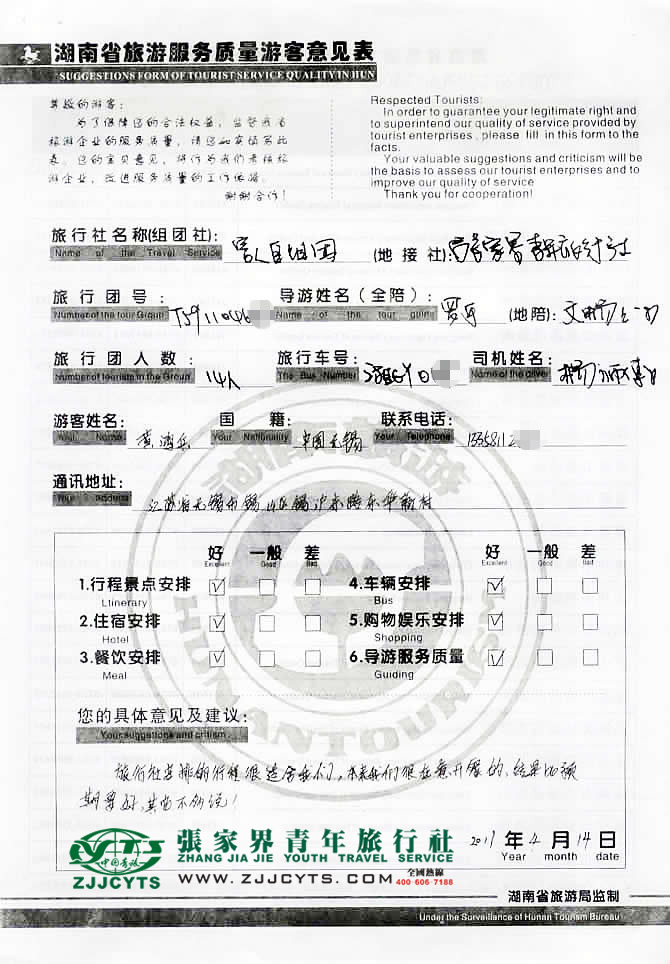 江蘇無錫市“黃先生”與張家界青旅旅游顧問——“田小美”在3月27日取得聯(lián)系,經(jīng)過3次的溝通商談,雙方達成協(xié)議并簽訂了《國內(nèi)旅游組團標準合同》,黃先生14人貴賓一行于4月10日晚抵達張家界,4月11日上午便開始為期3天行程的玩轉(zhuǎn)湘西之旅。 此次行程是由我們優(yōu)秀導(dǎo)游——文暢暢,負責(zé)旅游接待工作,文導(dǎo)在旅游過程中講解詳細,服務(wù)周到,客人也很滿意。并給予導(dǎo)游服務(wù)較高的評價!