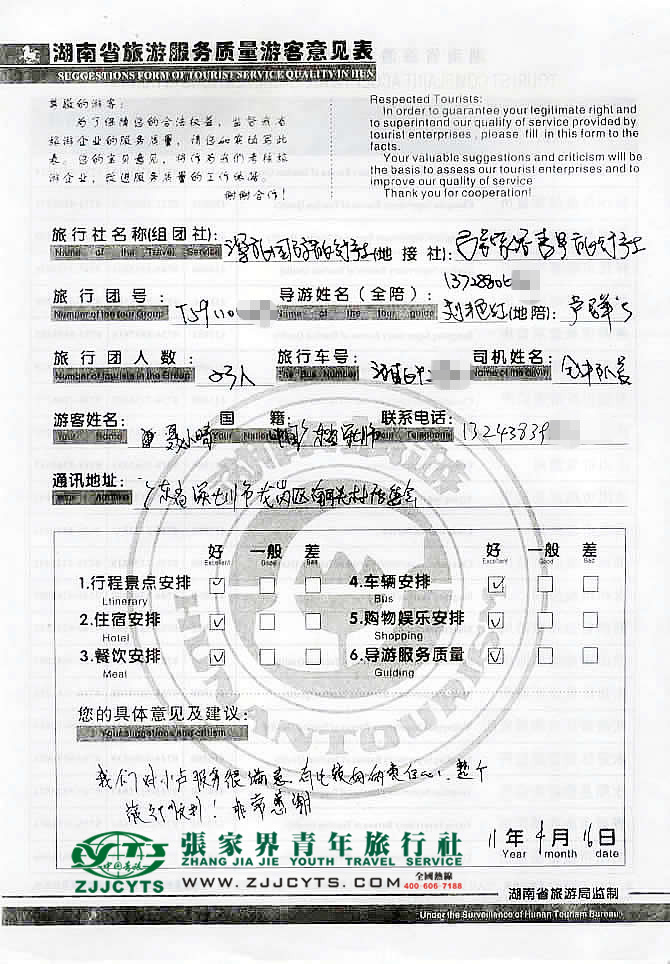 在此感謝"深圳國旅港澳黃金假期"給予青旅的合作機會,同時也感謝聶女士23人貴賓一行對我社行程及導游安排的配合與支持,歡迎您和朋友們再次蒞臨美麗的張家界做客。--客服“趙艷芳”留言。