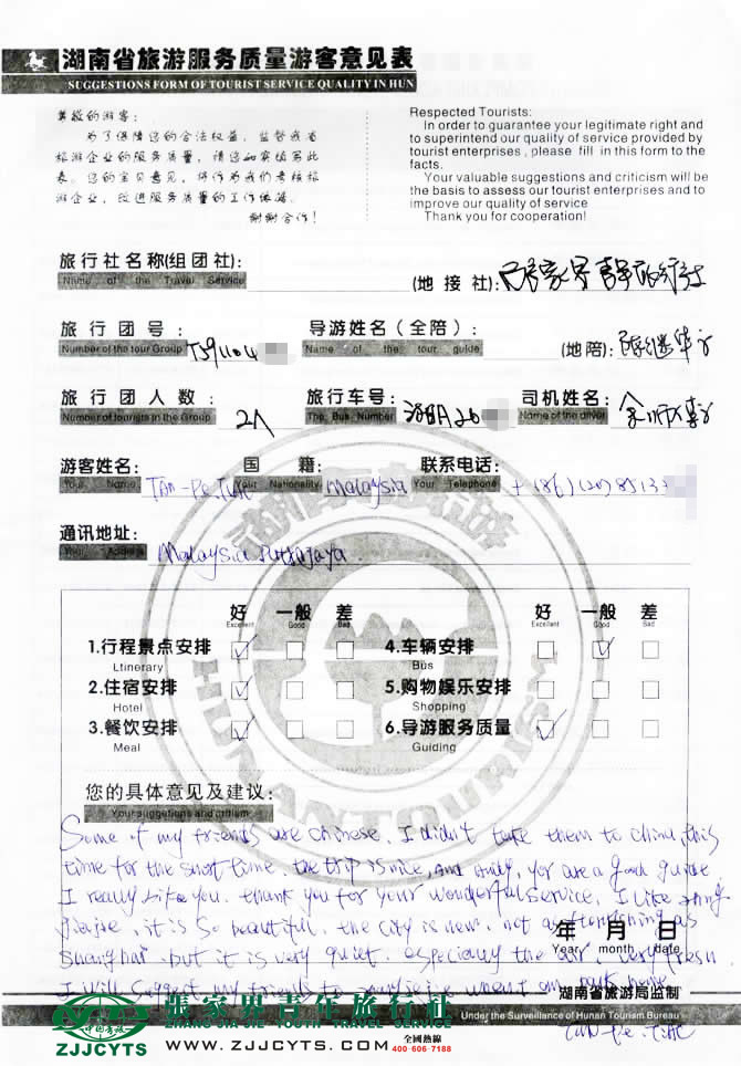 此次行程是由我們優(yōu)秀導(dǎo)游——陳繼華,負(fù)責(zé)旅游接待工作,陳導(dǎo)在旅游過程中,講解詳細(xì),服務(wù)周到,新加坡客人也很滿意。并給予導(dǎo)游“高質(zhì)量”評(píng)價(jià)! |