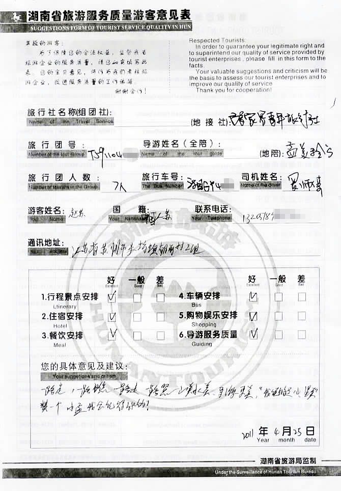 | 在此感謝“江蘇趙先生”以及同行6人貴賓一行,對(duì)我社行程及導(dǎo)游安排的配合與支持,也感謝您對(duì)我們的安排和導(dǎo)游的服務(wù)做出如此之高的評(píng)價(jià),這同時(shí)也激勵(lì)了我們,以后我們會(huì)認(rèn)真的把工作做好、做細(xì),讓每一位客人選擇張家界青旅的為之服務(wù)的游客,都能滿意而返,這也是我們的工作目標(biāo),歡迎您和部下們?cè)俅紊W臨美麗的張家界做客。--客服“李 霞”留言。2011-04-29 |