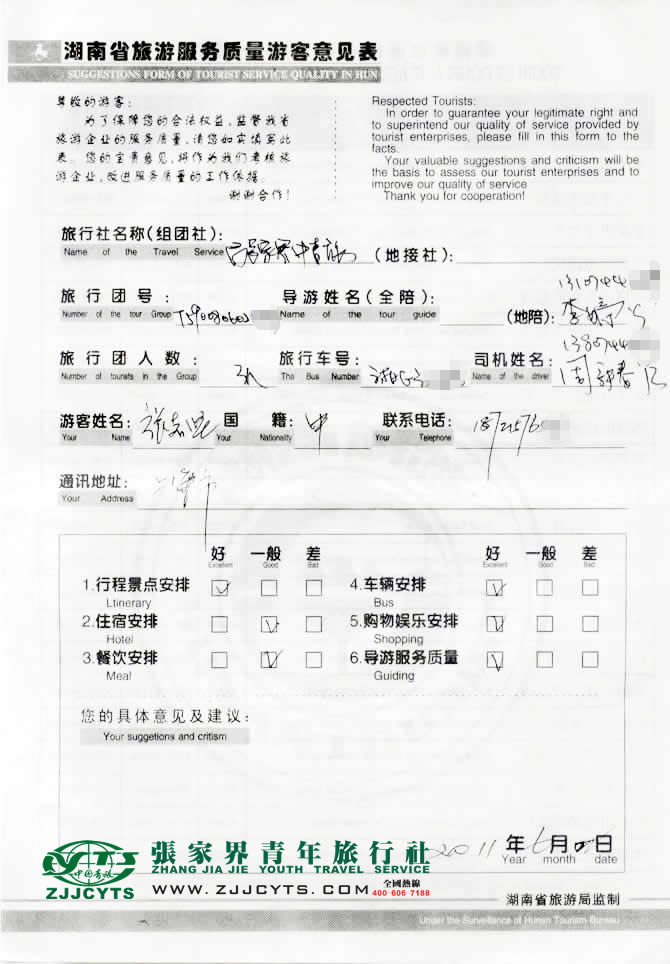 上海閔行區(qū)“張先生”與張家界青旅旅游顧問——客服“黃靜”在5月14日取得聯(lián)系,并與張先生就行程安排和其旅游的具體要求服務范圍,做了多次的在線溝通,此后經過細致的商磋,最終在5月19日確立《國內旅游組團接待合同》,并委托我社預訂航空。并且確立由我社負責全程接待安排;張先生一行3人,于5月28日晚乘坐上海航空航班抵達張家界,次日便開始了4天行程的走進的美麗張家界之旅。 06月02日。搭乘航班返程。