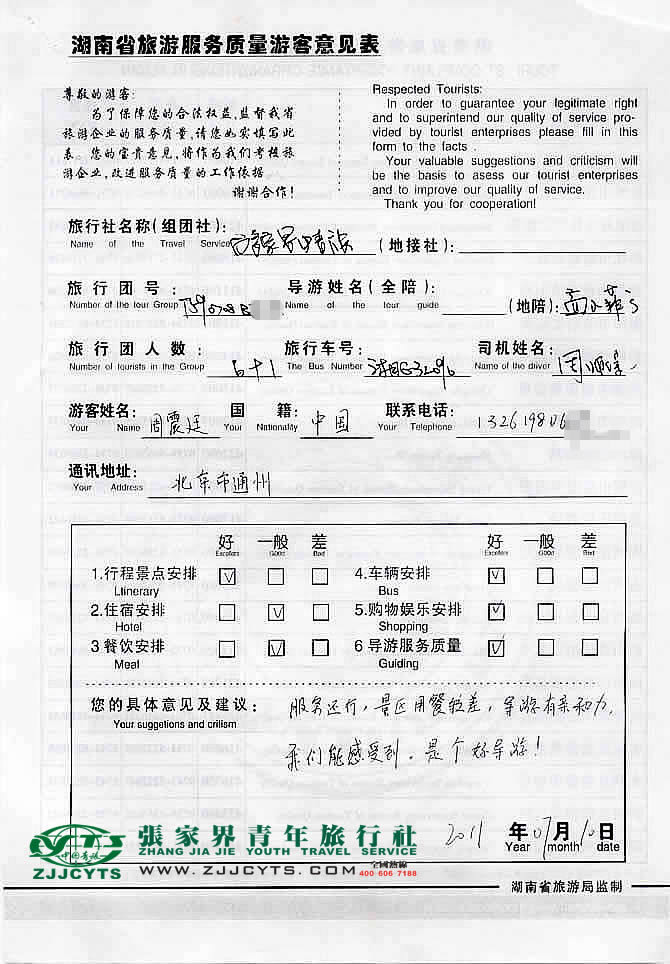 北京通州區(qū)“周先生”與張家界青旅旅游顧問(wèn)——客服“王國(guó)華”在6月09日得聯(lián)系,并就行程的合理選擇、旅游過(guò)程的具體要求、服務(wù)范圍,做了多次在線溝通和電話溝通,經(jīng)過(guò)細(xì)致的商磋,最終在06月23日確立《國(guó)內(nèi)旅游組團(tuán)接待合同》,并正式確立由我社負(fù)責(zé)全程接待安排;周總一行7人(其中含有1.2以上學(xué)齡學(xué)生1名),于07月07日中午乘坐K267次空調(diào)特快,于次日7月08日上午11:15許抵達(dá)張家界,我社業(yè)務(wù)部經(jīng)理張經(jīng)理、導(dǎo)游和司機(jī)前往迎接站,當(dāng)日便開(kāi)始了為期3天行程的走進(jìn)魅力湘西之旅。 07月10日下午從鳳凰返程張家界;搭乘K968/K965次返程。
