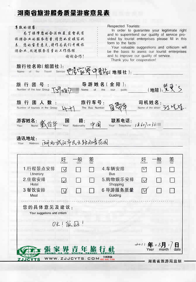 08月15日戴小姐一行5人(其中有一滿70歲老人,一個小孩)乘坐火車于12:00許抵達張家界,我社導游和司機迎接站,當日便開始了為期3天行程的走進張家界之旅;于08月17日下午17:00多送團,貴賓搭乘張家界-武漢K968次18:00許返程回家。