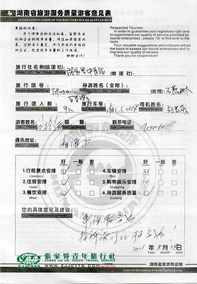湖南湘潭市“劉先生”與張家界青旅旅游顧問——客服“谷盈”在08月19日取得聯(lián)系,并就線路、行程的合理選擇、旅游景點的選定,以及服務(wù)的具體要求、范圍,做了多次在線溝通和電話溝通,經(jīng)過仔細的商磋,最終在08月21日雙方簽訂了《國內(nèi)旅游組團接待合同》,并正式確立由我社負責全程接待安排;劉總一行9人,于08月25上午從湘潭自駕車(3臺),于當日抵達張家界市,住宿晶悅酒店,晚上觀看天門狐仙演出,次日便開始了為期3天行程的張家界之旅,08月28日中午午餐后自駕返程。