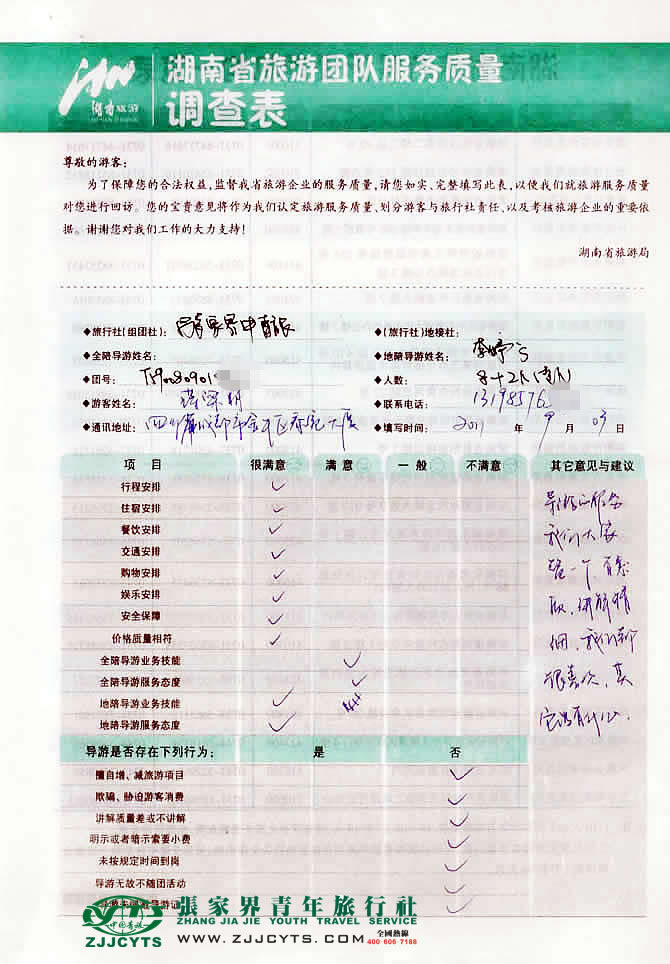 四川成都市“蔣先生”與張家界青旅旅游顧問——客服經理“李朝陽”在08月09日取得聯(lián)系,并就線路、行程的合理選擇、旅游景點的選定,以及服務的具體要求、范圍與蔣先生,做了多次在線溝通和電話溝通,最終在08月17日雙方簽訂了《國內旅游組團接待合同》,并正式確立由我社負責全程接待安排;蔣先生一行10人,于08月31下午從成都搭乘CA4377次航班,于當日晚22:20許抵達張家界,當天我社安排導游和司機迎接站,次日便開始了為期3天行程的張家界經典之旅,09月03日下午14:00許結束行程,貴賓在張家界搭乘火車趕赴懷化,在懷化中轉返程。