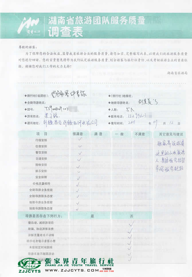新疆昌吉市“梁先生”與張家界青旅旅游顧問——客服“李朝陽”在09月04日取得聯(lián)系,并就線路、行程的合理選擇、旅游景點(diǎn)的選定,以及服務(wù)的具體要求、范圍與梁先生,做了電話溝通,得悉梁先生一行來長沙參加專題會議,故我們推薦了比較合適的線路,也得到貴賓的認(rèn)同,最終在09月05日雙方簽訂了《國內(nèi)旅游組團(tuán)接待合同》,并正式確立由我社負(fù)責(zé)全程接待安排;梁先生一行5人,于09月08下午4點(diǎn)許,自長沙出發(fā)搭乘大巴車抵達(dá)張家界,約晚上23點(diǎn)許抵達(dá),住宿東航觀光酒店,于次日參加我社散客拼團(tuán)游,開始了為期4天行程的湘西之旅,該行程于09月12日下午17:00許在張家界結(jié)束,貴賓一行搭乘長途客車返程回長沙。在長沙中轉(zhuǎn)返程