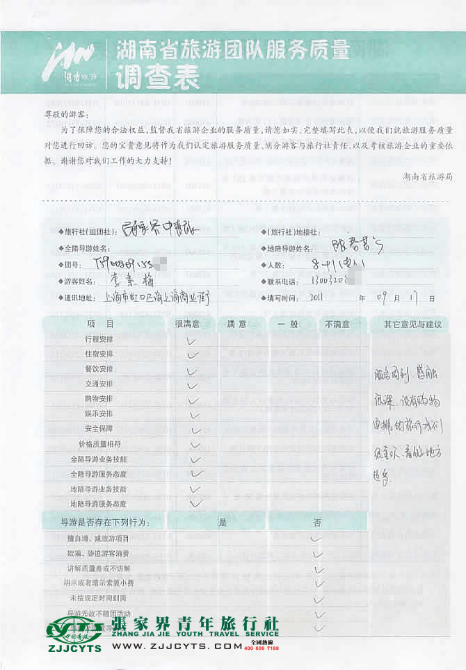 | 上海上海市“李小姐”與張家界青旅旅游顧問——客服經(jīng)理“張德建”在09月07日取得聯(lián)系,并就線路、行程的合理選擇、旅游景點(diǎn)的選定,以及服務(wù)的具體要求、范圍與上海李小姐誒做了多次電話溝通,最終在09月11方簽訂了《國內(nèi)旅游組團(tuán)接待合同》,并正式確立由我社負(fù)責(zé)全程接待安排;李小姐、頌先生一行9人,于09月14日搭乘火車【K533】次,與次日上午07:00許抵達(dá)張家界,當(dāng)日便開始了為期3天行程的湘西之旅,該行程于09月17日下午17:00許在張家界結(jié)束,貴賓一行搭乘K1374次火車返程。