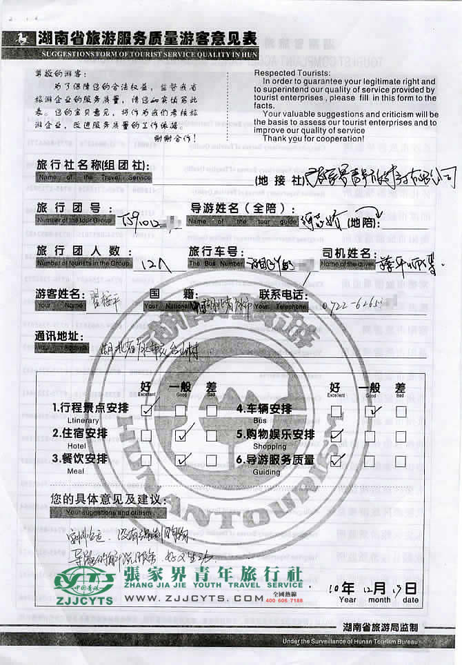 湖北廣水市“瞿先生”與張家界青旅旅游顧問——宋嘉在2010年12月10日取得聯(lián)系,經(jīng)過2次的商談,雙方達(dá)成協(xié)議并簽訂了《國內(nèi)旅游組團(tuán)標(biāo)準(zhǔn)合同》,瞿先生12人一行于12月13日凌晨1點(diǎn)抵達(dá)張家界,之后便開始了4天行程的探密湘西之旅。 此次行程是由我們優(yōu)秀導(dǎo)游——何志嬌,負(fù)責(zé)旅游接待工作,何導(dǎo)在旅游過程中講解詳細(xì),服務(wù)周到,客人非常滿意。丙給予導(dǎo)游服務(wù)做出了好評!