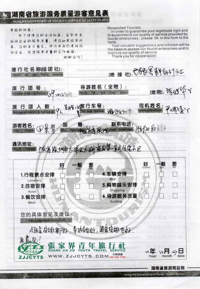 廣東深圳市“田先生”與張家界青旅旅游顧問——陳苑梅在2010年12月16日取得聯(lián)系,經(jīng)過3次的商談,雙方達(dá)成協(xié)議并簽訂了《國內(nèi)旅游組團(tuán)標(biāo)準(zhǔn)合同》,于12月23日下午抵達(dá)張家界,之后便開始了4天行程的張家界之旅。 此次行程是由我們優(yōu)秀導(dǎo)游——陳繼華,負(fù)責(zé)旅游接待工作,陳導(dǎo)在旅游過程中講解詳細(xì),服務(wù)周到,客人也很滿意。并給導(dǎo)游服務(wù)較高評價(jià)!