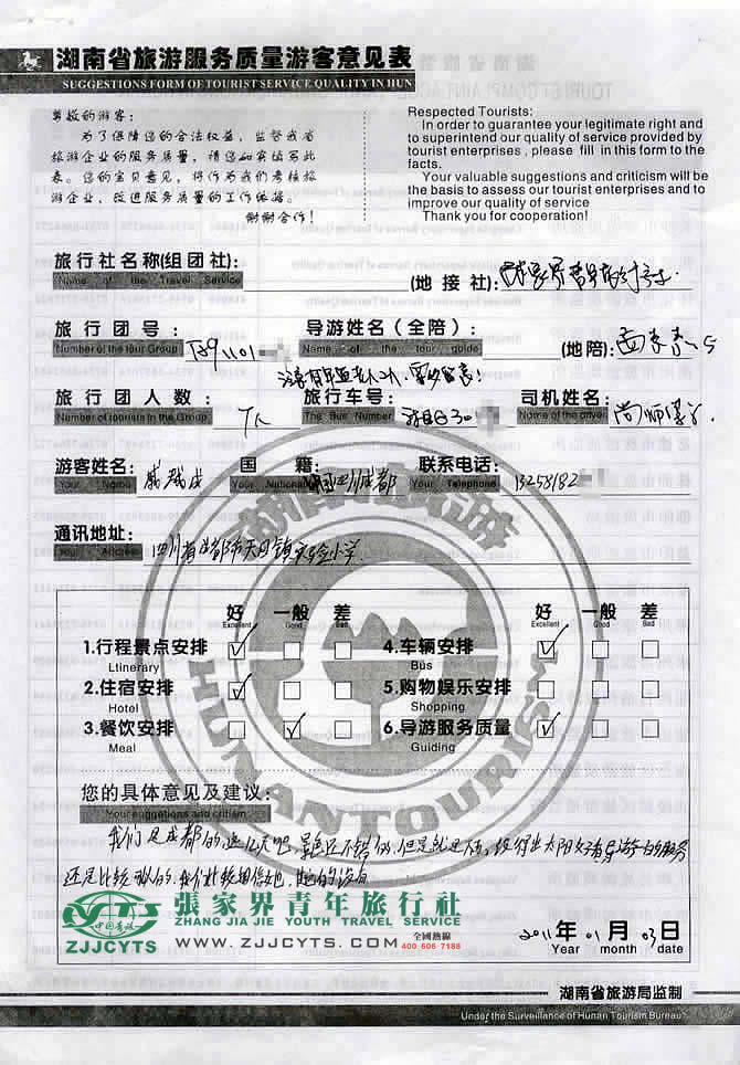 四川成都市“戚先生”與張家界青旅旅游顧問——劉文英在2010年12月20日取得聯(lián)系,經(jīng)過幾次的商談,雙方達(dá)成協(xié)議并簽訂了《國內(nèi)旅游組團(tuán)標(biāo)準(zhǔn)合同》,于2010年12月31日下午抵達(dá)張家界,之后便開始了4天行程的湘西之旅。 此次行程是由我們優(yōu)秀導(dǎo)游——孟素素,負(fù)責(zé)旅游接待工作,孟導(dǎo)在旅游過程中講解詳細(xì),服務(wù)周到,客人也很滿意。并給予導(dǎo)游服務(wù)較高評價!