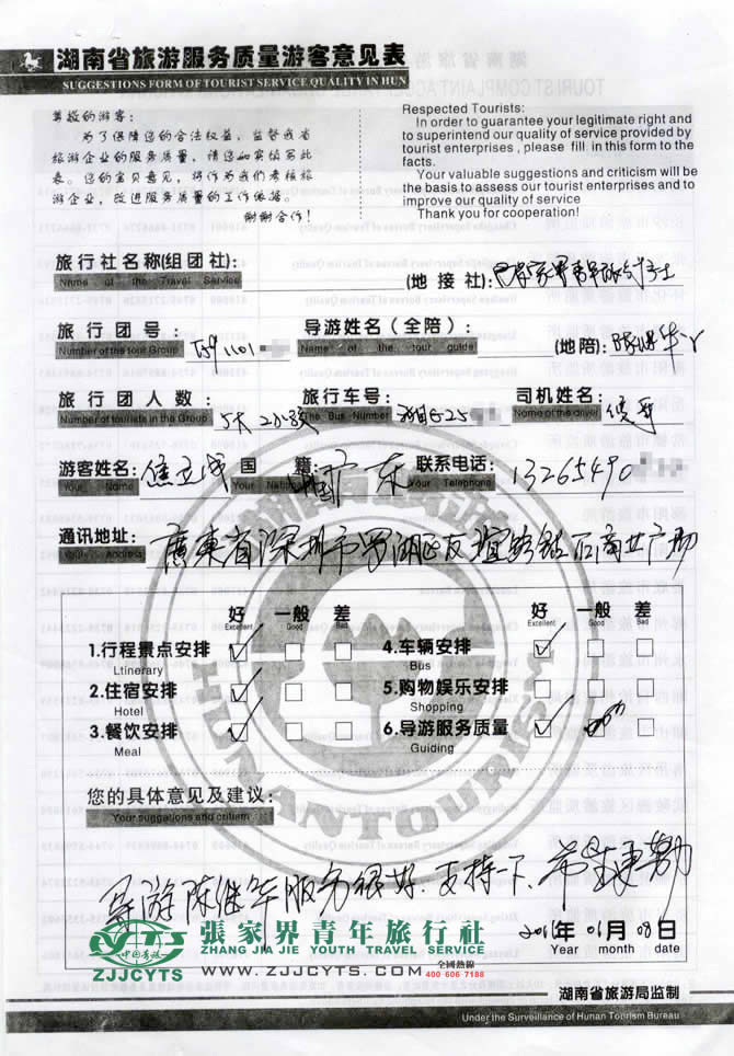 廣東深圳市“焦先生”與張家界青旅旅游顧問(wèn)——宋嘉在01月02日取得聯(lián)系,經(jīng)過(guò)幾次的商談,雙方達(dá)成協(xié)議并簽訂了《國(guó)內(nèi)旅游組團(tuán)標(biāo)準(zhǔn)合同》,于01月05日下午6點(diǎn)抵達(dá)張家界,之后便開(kāi)始了湘西之旅。 此次行程是由我們優(yōu)秀導(dǎo)游——陳繼華,負(fù)責(zé)旅游接待工作,陳導(dǎo)在旅游過(guò)程中講解詳細(xì),服務(wù)周到,客人非常滿意。并給予導(dǎo)游服務(wù)較高評(píng)價(jià)!
