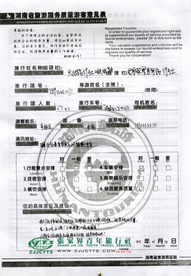 河北秦皇島市“辛先生”與張家界青旅旅游顧問——胡曉蘭在01月02日取得聯(lián)系,經(jīng)過與天際旅行觀光假期3次的商談,雙方達成協(xié)議并簽訂了《國內(nèi)旅游組團標準合同》,辛先生一行18人于01月06日下午抵達張家界,之后便開始了湘西之旅。 此次行程是由我們優(yōu)秀導游——蔣明亮,負責旅游接待工作,蔣導在旅游過程中講解詳細,服務(wù)周到,客人也很滿意。并給予導游服務(wù)品質(zhì)評分80分!