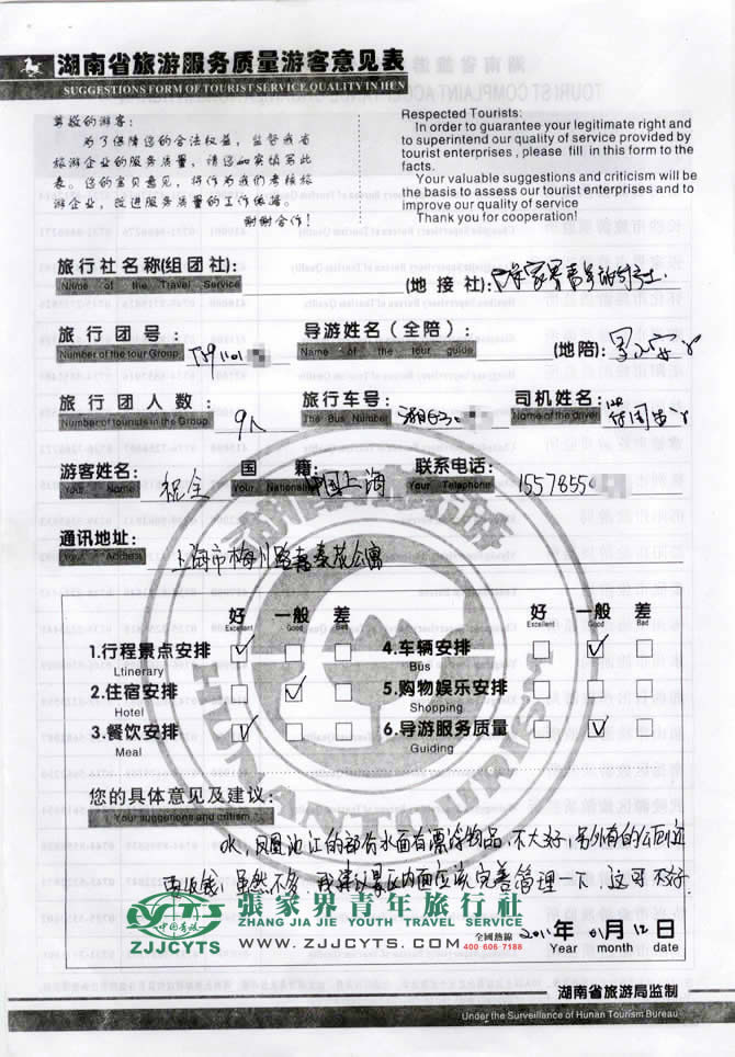 | 上海梅川路“祝先生”與張家界青旅旅游顧問——陳苑梅在01月05日取得聯(lián)系,經(jīng)過3次的商談,雙方達(dá)成協(xié)議并簽訂了《國內(nèi)旅游組團(tuán)標(biāo)準(zhǔn)合同》,祝先生一行9人于01月09日下午抵達(dá)張家界,之后便開始了湘西之旅。