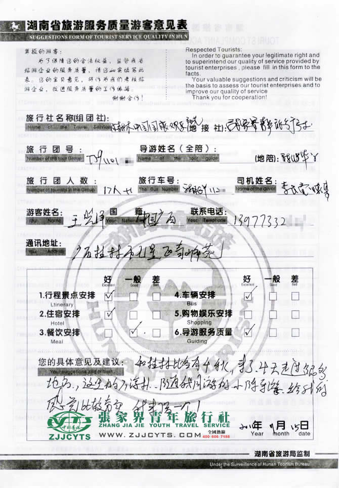 廣西桂林市“王先生”與張家界青旅旅游顧問——卓東來在1月06日取得聯(lián)系,經(jīng)過幾次的商談,雙方達(dá)成協(xié)議并簽訂了《國內(nèi)旅游組團標(biāo)準(zhǔn)合同》,于1月10日晚抵達(dá)張家界,之后便開始了游覽湘西全景之旅。 此次行程是由我們優(yōu)秀導(dǎo)游——陳繼華,負(fù)責(zé)旅游接待工作,陳導(dǎo)在旅游過程中講解詳細(xì),服務(wù)周到,客人也很滿意。并給予導(dǎo)游服務(wù)“感覺比較夯實”的評價!