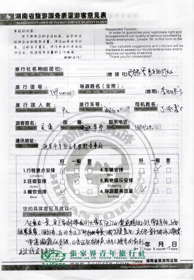再次感謝吳先生9人一行選擇張家界青年旅行社,以及您對張家界青旅的信任與支持。我們會繼續(xù)努力,做好旅游接待工作。期待下一次與您的合作,祝您愉快!--曹娟留言。