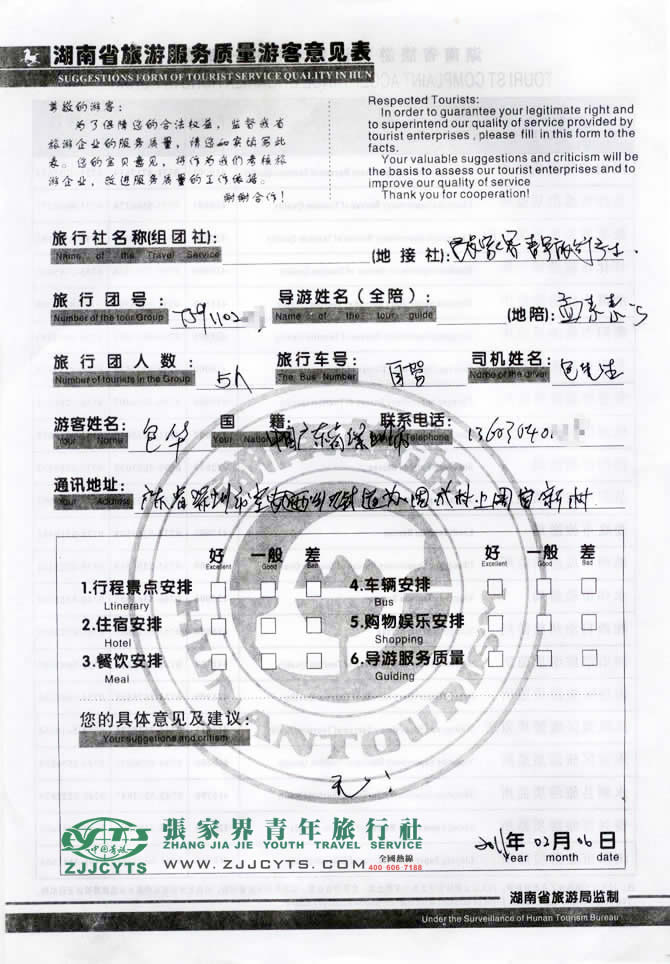 廣東深圳市“包先生”與張家界青旅旅游顧問——?jiǎng)⑽挠⒃?1月10日取得聯(lián)系,經(jīng)過3次的商談,雙方達(dá)成協(xié)議并簽訂了《國內(nèi)旅游組團(tuán)標(biāo)準(zhǔn)合同》,包先生5人一行自駕車在01月31日晚抵達(dá)張家界,之后便開始了在張家界過年度假之旅。 此次行程是由我們優(yōu)秀導(dǎo)游——孟素素,負(fù)責(zé)旅游接待工作,孟導(dǎo)在旅游過程中講解詳細(xì),服務(wù)周到,客人非常滿意。并給予導(dǎo)游服務(wù)好評(píng)!