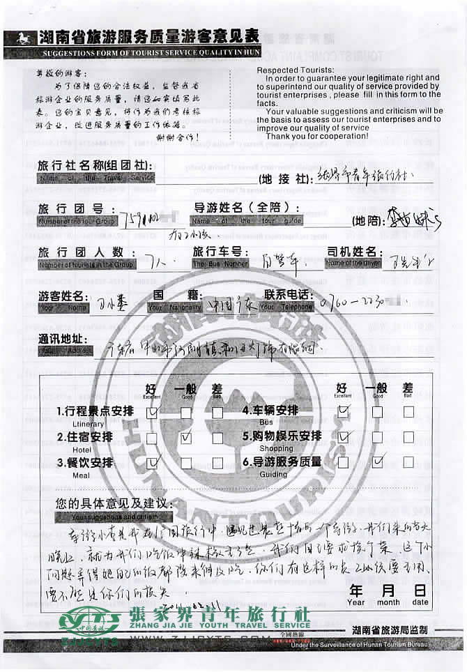 再次感謝衛(wèi)先生和朋友們能選擇張家界青年旅行社,以及您對張家界青旅的信任與支持。我們會繼續(xù)努力,歡迎您有時間再來下榻張家界,祝您工作順利,生活愉快!--張瑜珂留言