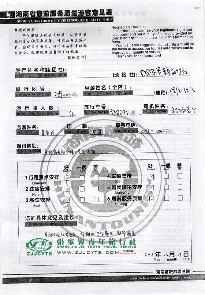 貴州貴陽市“董先生”與張家界青旅旅游顧問——宋嘉在2月27日取得聯(lián)系,經(jīng)過幾次的商談,雙方達成協(xié)議并簽訂了《國內(nèi)旅游組團標準合同》,于3月03日中午抵達張家界,之后便開始了湘西之旅。 此次行程是由我們優(yōu)秀導(dǎo)游——周玉紅,負責(zé)旅游接待工作,周導(dǎo)在旅游過程中講解詳細,服務(wù)周到,客人也很滿意。并給予導(dǎo)游服務(wù)給予“導(dǎo)游全程非常負責(zé),很耐心也敬業(yè)”的好評!