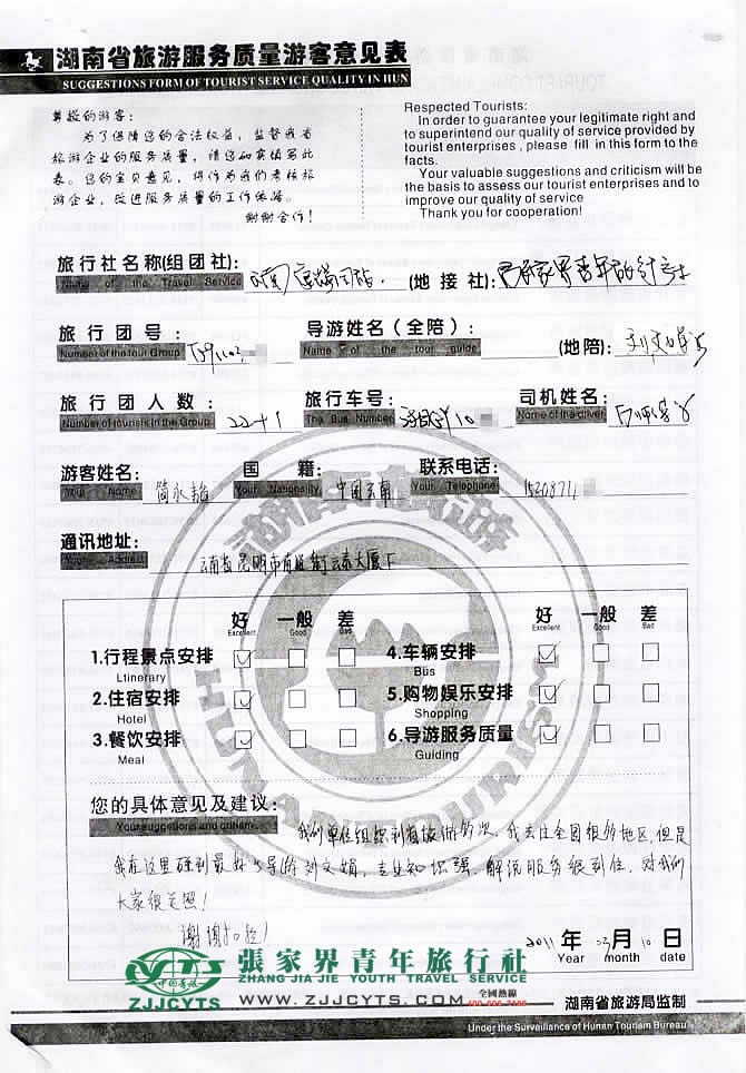 云南昆明市“簡(jiǎn)先生”與張家界青旅旅游顧問——楊春蘭在3月04日取得聯(lián)系,經(jīng)過2次的商談,雙方達(dá)成協(xié)議并簽訂了《國(guó)內(nèi)旅游組團(tuán)標(biāo)準(zhǔn)合同》,于3月06日晚抵達(dá)張家界,之后便開始了湘西之旅。 此次行程是由我社優(yōu)秀導(dǎo)游——?jiǎng)⑽木辏?fù)責(zé)旅游接待工作,劉導(dǎo)在旅游過程中講解詳細(xì),服務(wù)周到,客人也很滿意。并給予導(dǎo)游服務(wù)“專業(yè)知識(shí)強(qiáng),解說到位”評(píng)價(jià)!