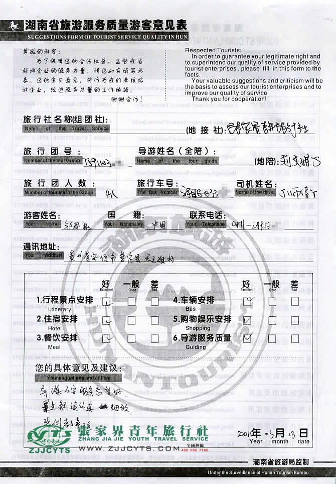 貴州安順市“鄔女士”與張家界青旅旅游顧問——楊春蘭在3月15日晚取得聯(lián)系,經(jīng)過一次的商談,雙方達成協(xié)議并簽訂了《國內(nèi)旅游組團標準合同》,于3月16日上午自鳳凰乘火車抵達張家界,次日便開始了張家界之旅。 此次行程是由我們優(yōu)秀導(dǎo)游——劉文娟,負責旅游接待工作,劉導(dǎo)在旅游過程中講解詳細,服務(wù)周到,客人也很滿意。并給予導(dǎo)游服務(wù)“服務(wù)態(tài)度好,景點解說認真細致”的高評價!