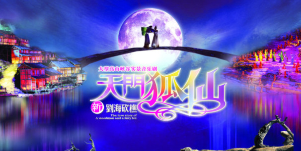 巍巍天門山,浩浩天門洞。雄偉奇峻的武陵山脈中,有一條長(zhǎng)5公里、海拔高差1000余米的峽谷;峽谷內(nèi)芳草遍地,溪流潺潺,時(shí)有云霧自谷內(nèi)溢出,宛若現(xiàn)世桃源!短扉T狐仙—新劉海砍樵》的主舞臺(tái)就與這奇峰、峽谷、森林、流瀑溶為一體,共同形成一個(gè)縱深數(shù)公里、橫寬和高差均逾千米、世界唯一的一座高山峽谷大舞臺(tái)!